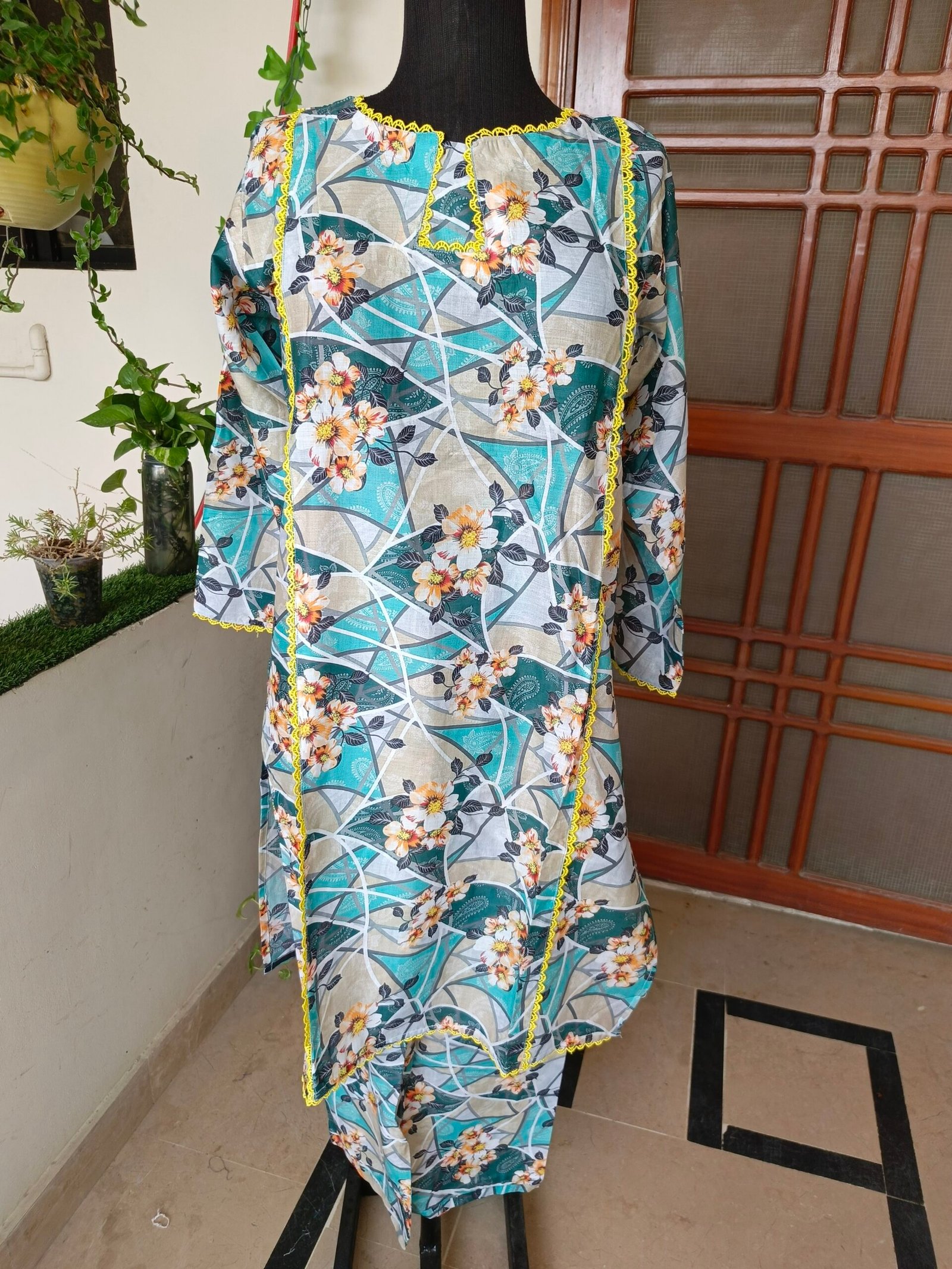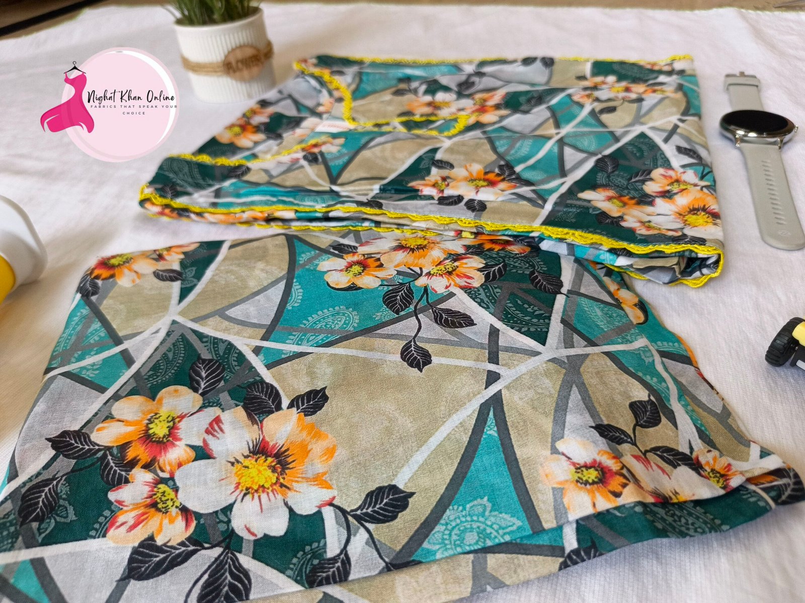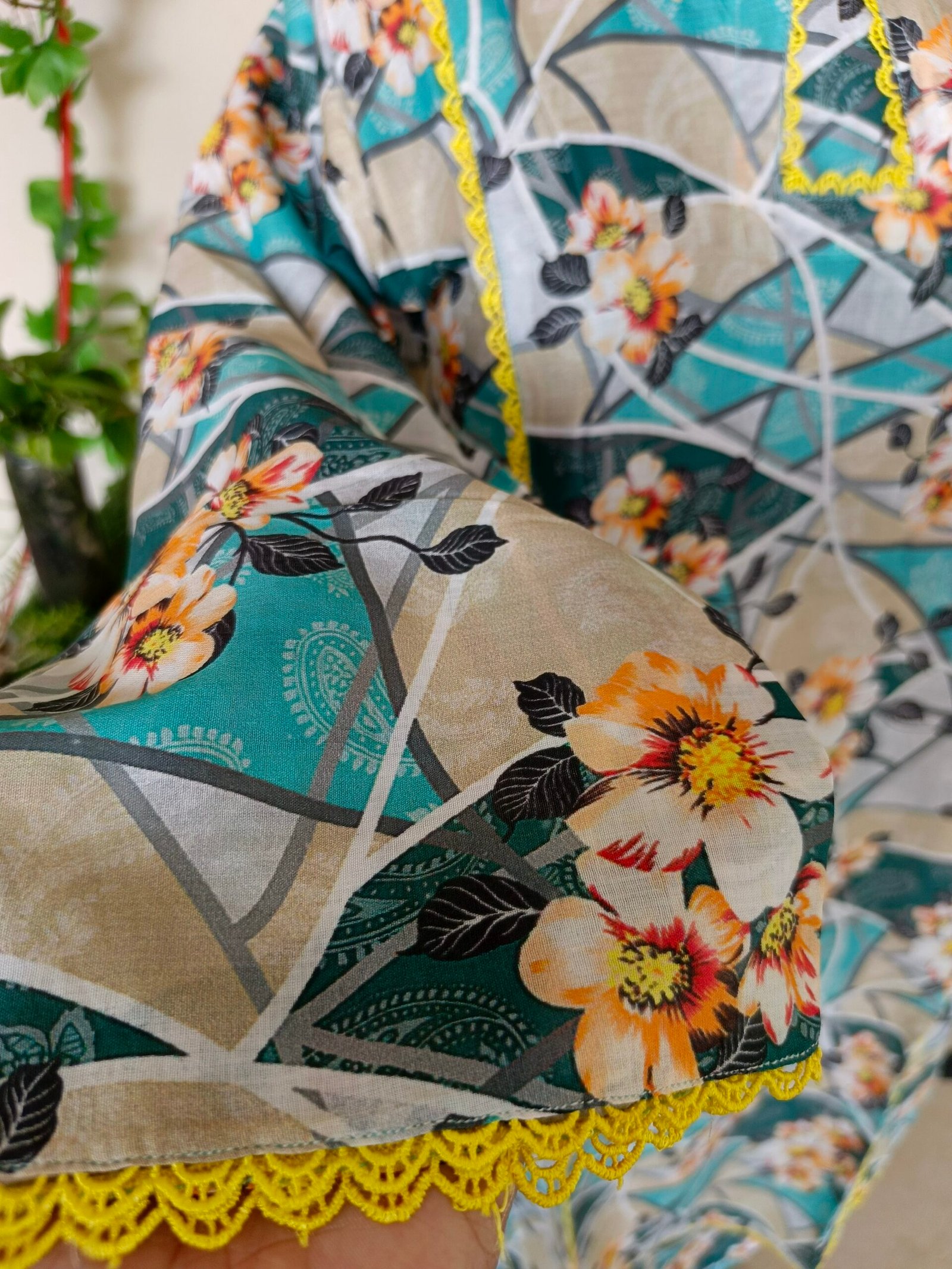This stylish two-piece Khaadi lawn suit features a beautifully printed floral and geometric pattern in shades of turquoise, grey, and white. The shirt has a straight-cut design with intricate yellow lace detailing along the neckline and borders, adding a touch of elegance. The matching trousers complete the look, making it perfect for casual and semi-formal wear.