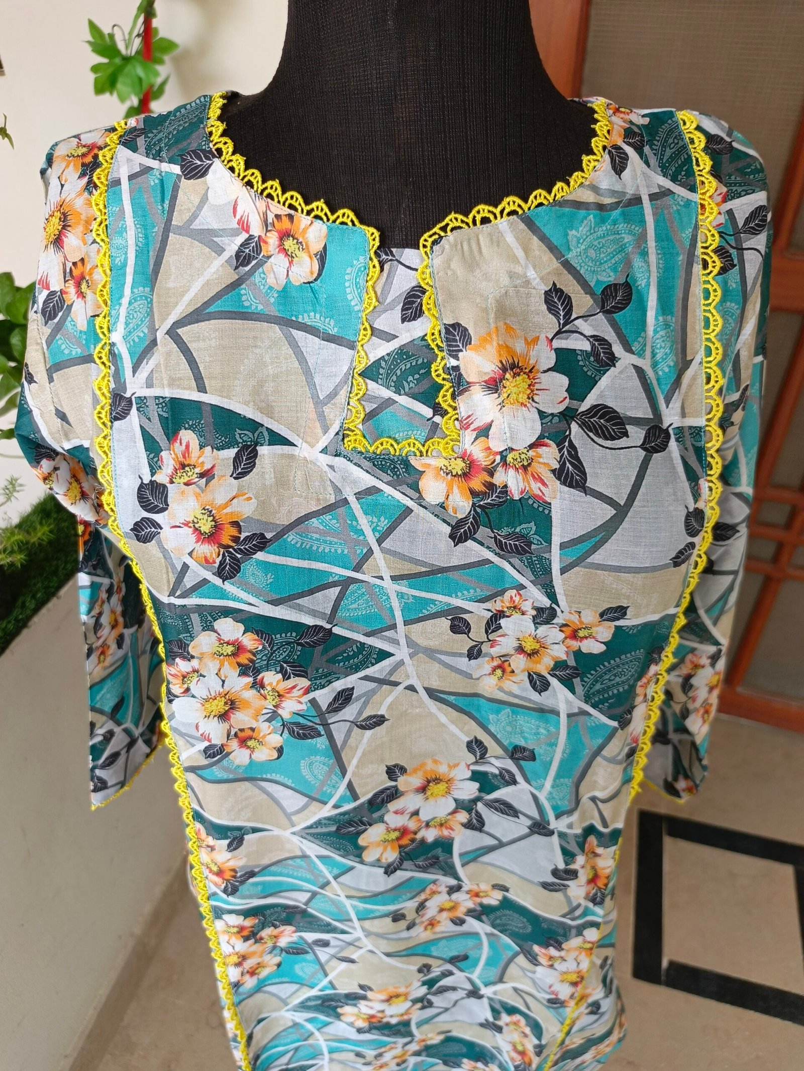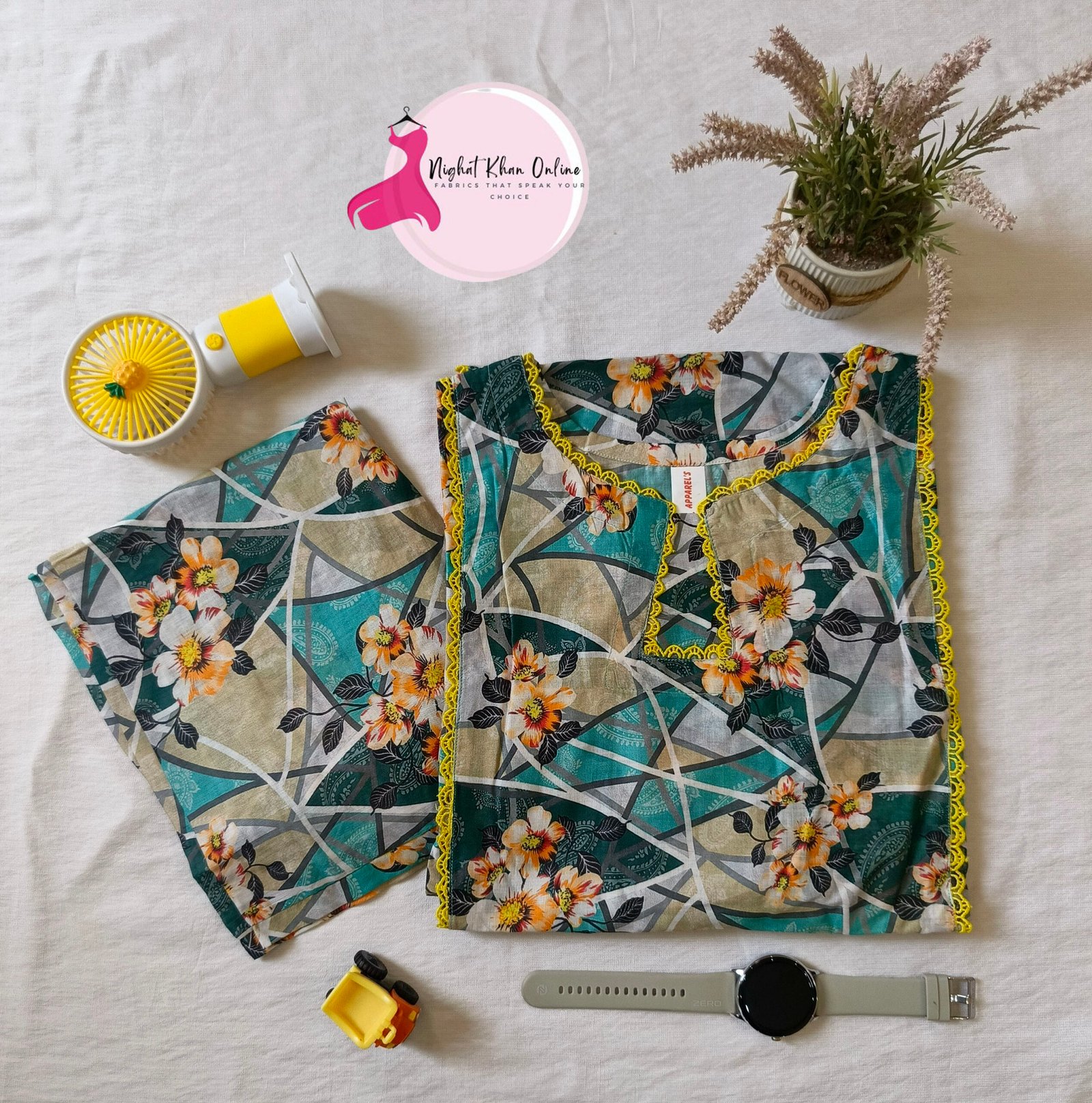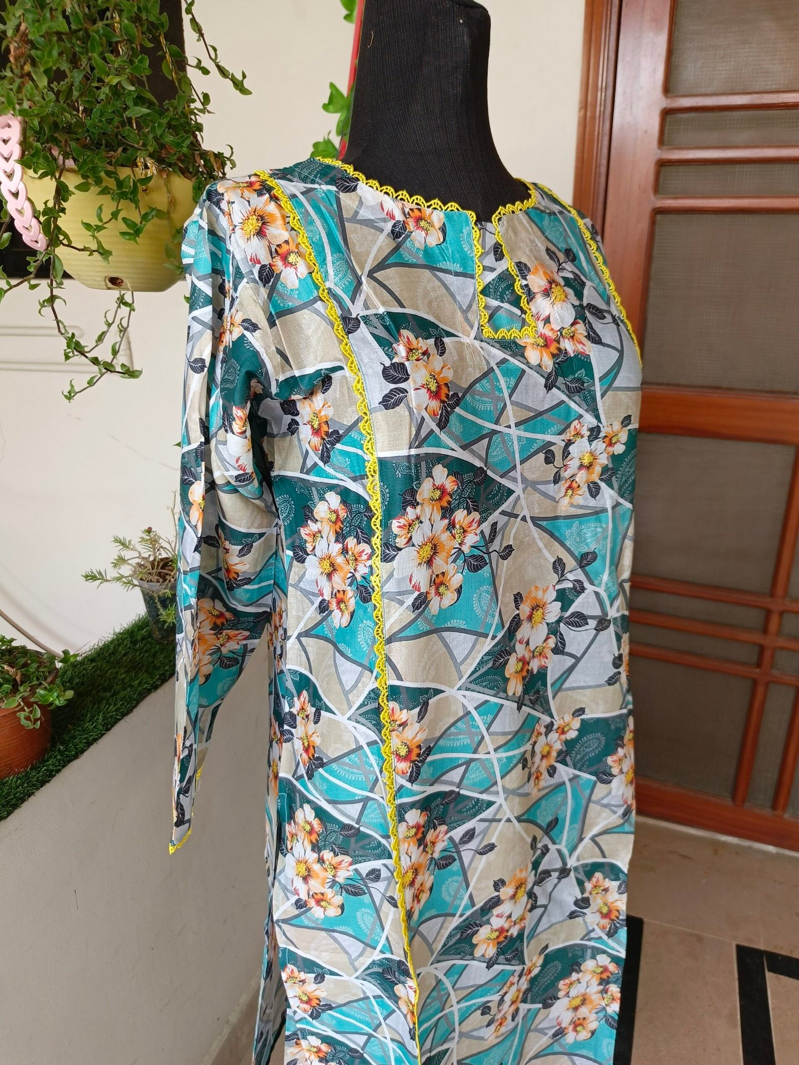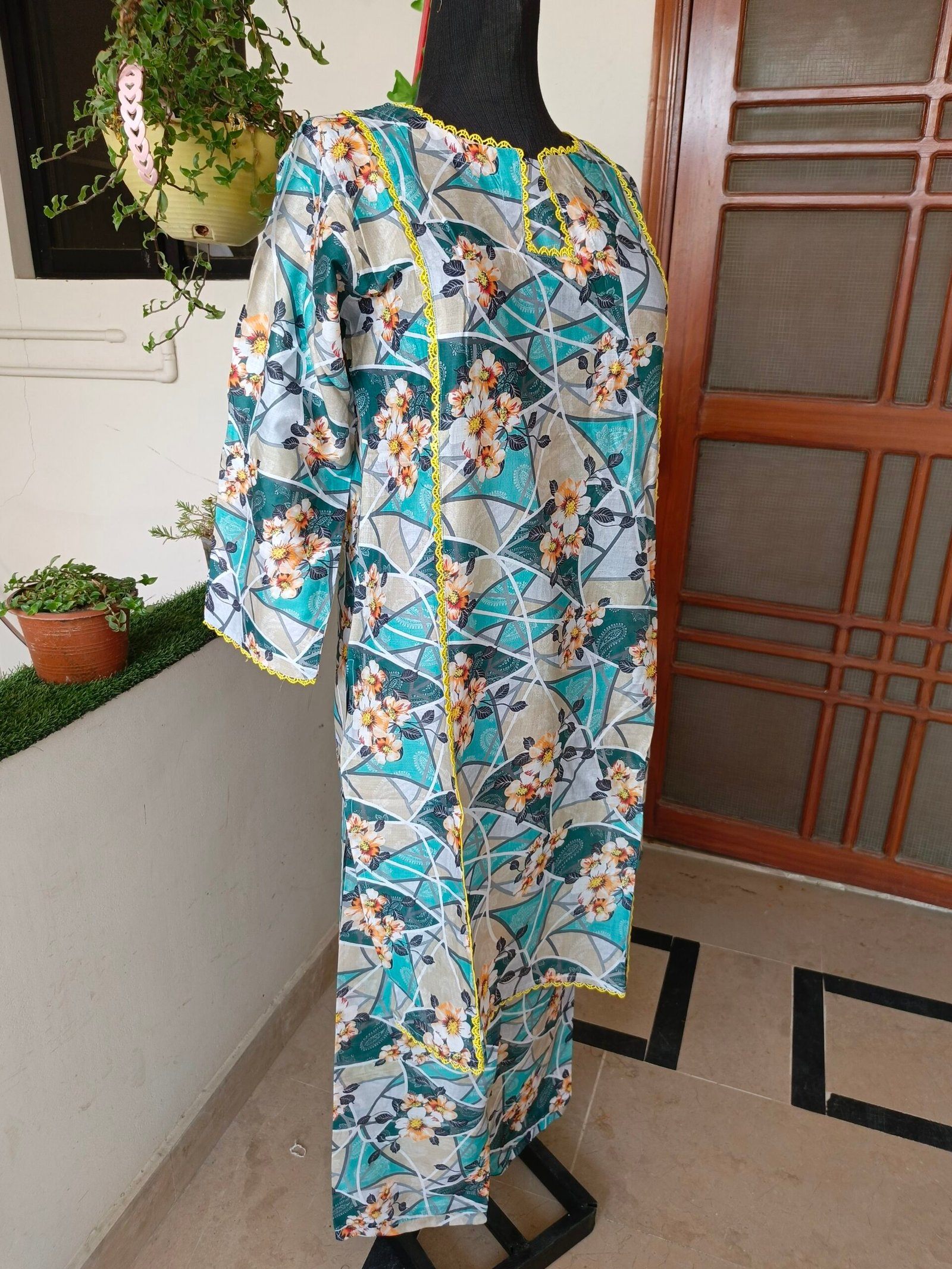 This stylish two-piece Khaadi lawn suit features a beautifully printed floral and geometric pattern in shades of turquoise, grey, and white. The shirt has a straight-cut design with intricate yellow lace detailing along the neckline and borders, adding a touch of elegance. The matching trousers complete the look, making it perfect for casual and semi-formal wear.