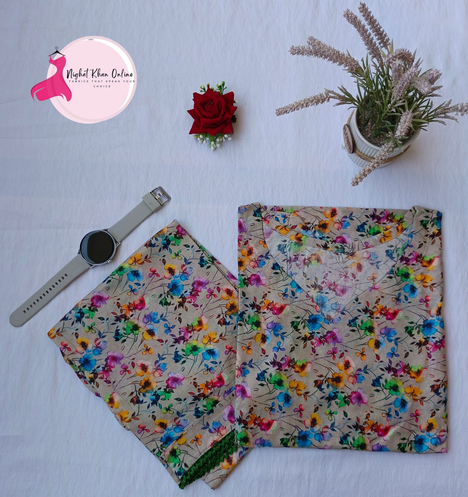Limited StockEmbrace the beauty of nature with this charming two-piece suit featuring a delicate multi-colored floral print on a soft beige base. The vibrant hues of blue, yellow, pink, and green bring a refreshing and lively touch to the outfit. Designed with a graceful V-neckline, this suit blends casual comfort with effortless style. Ideal for everyday wear or informal gatherings, it’s a versatile addition to your wardrobe, offering both elegance and ease.