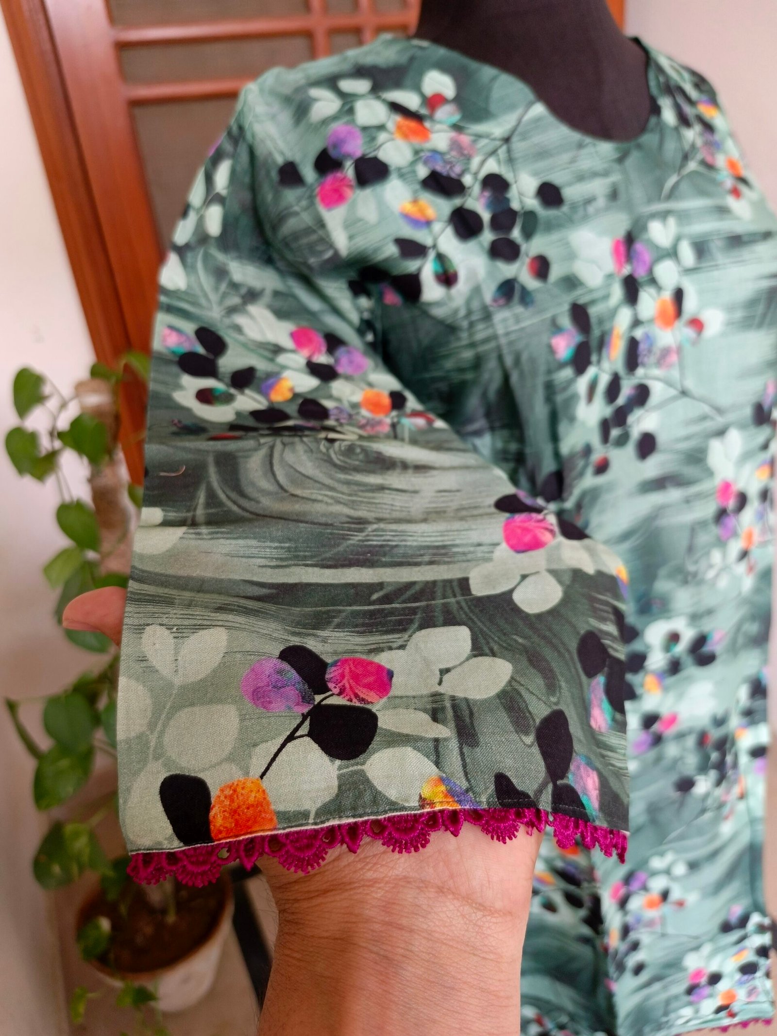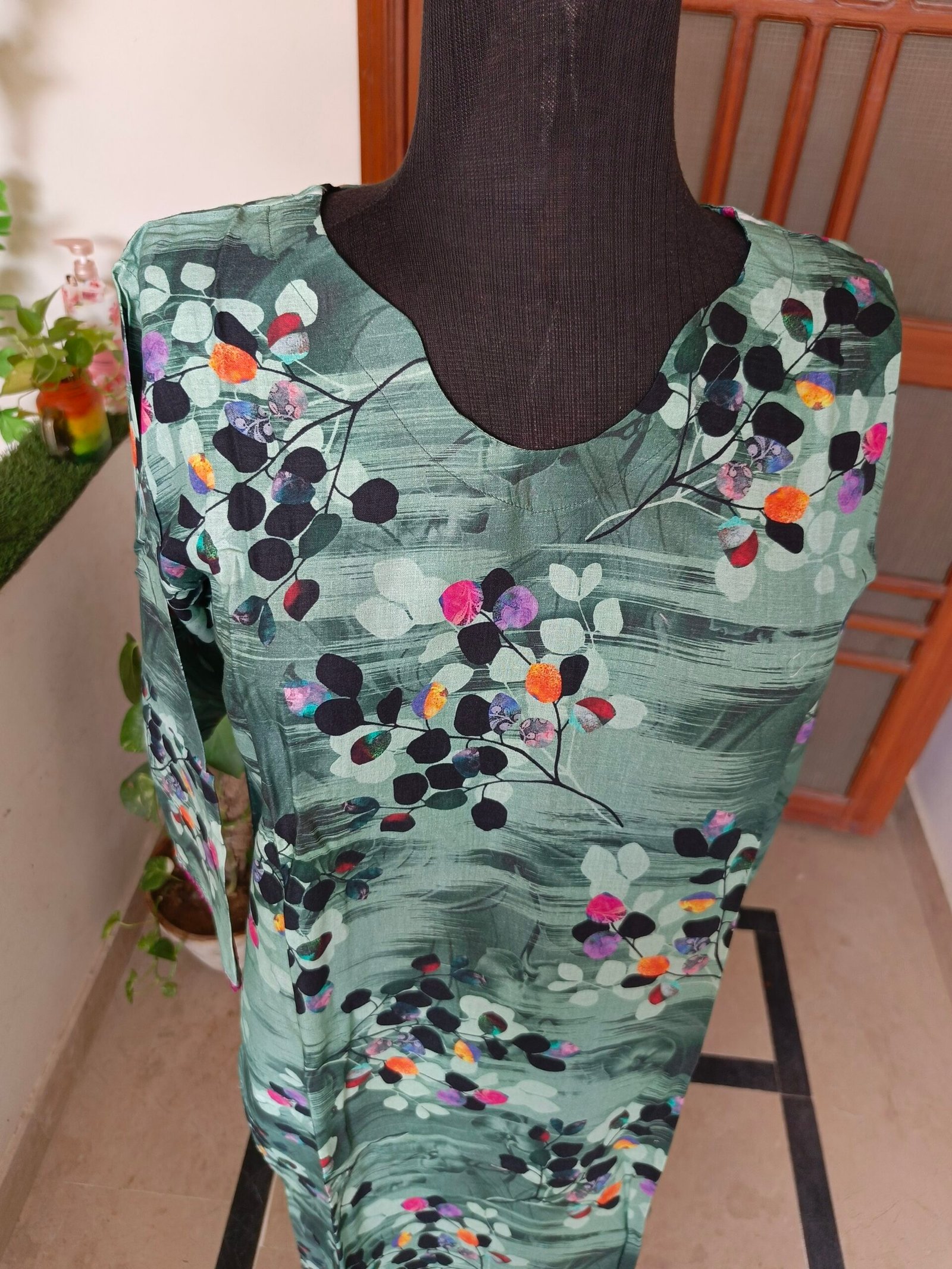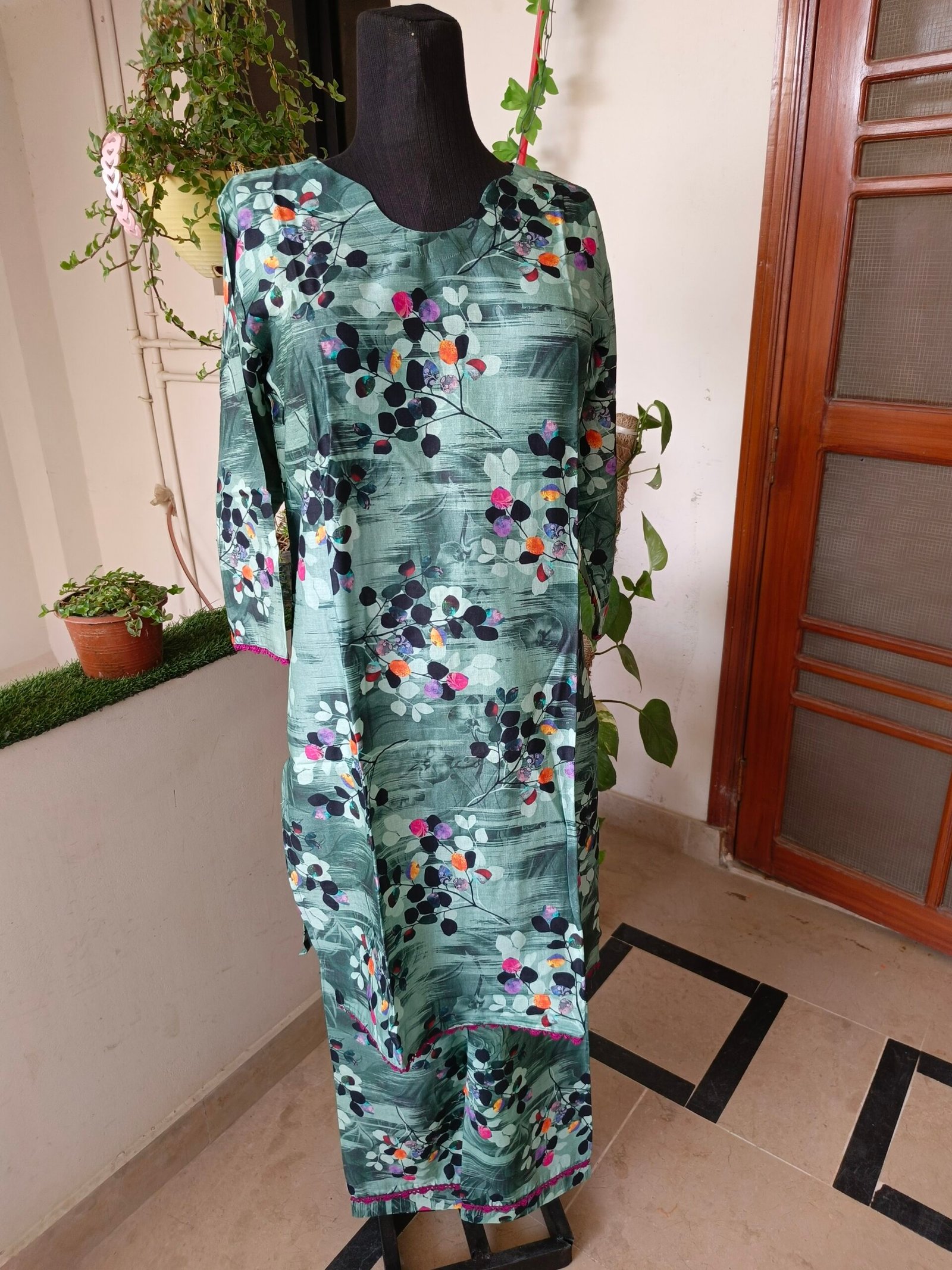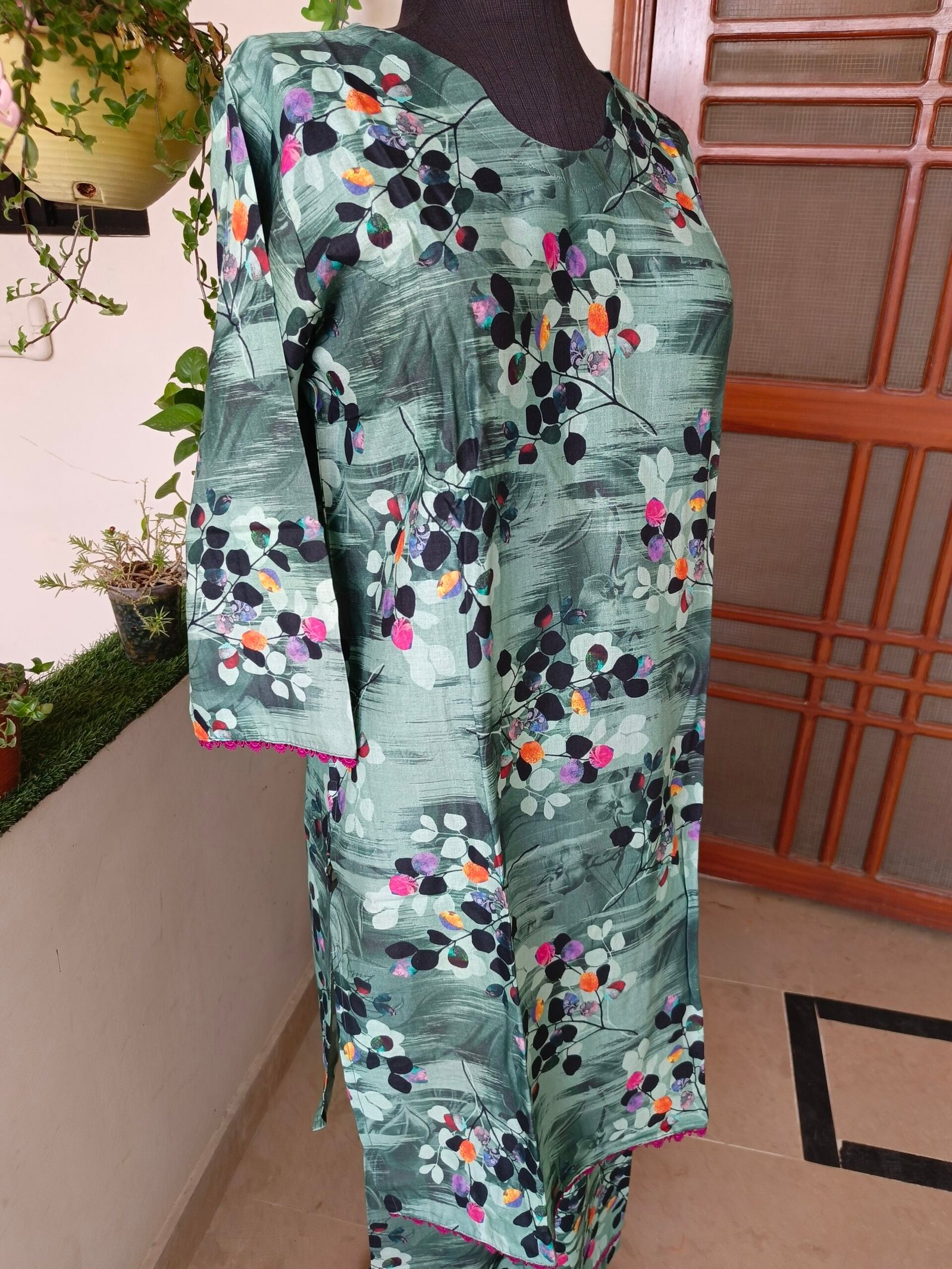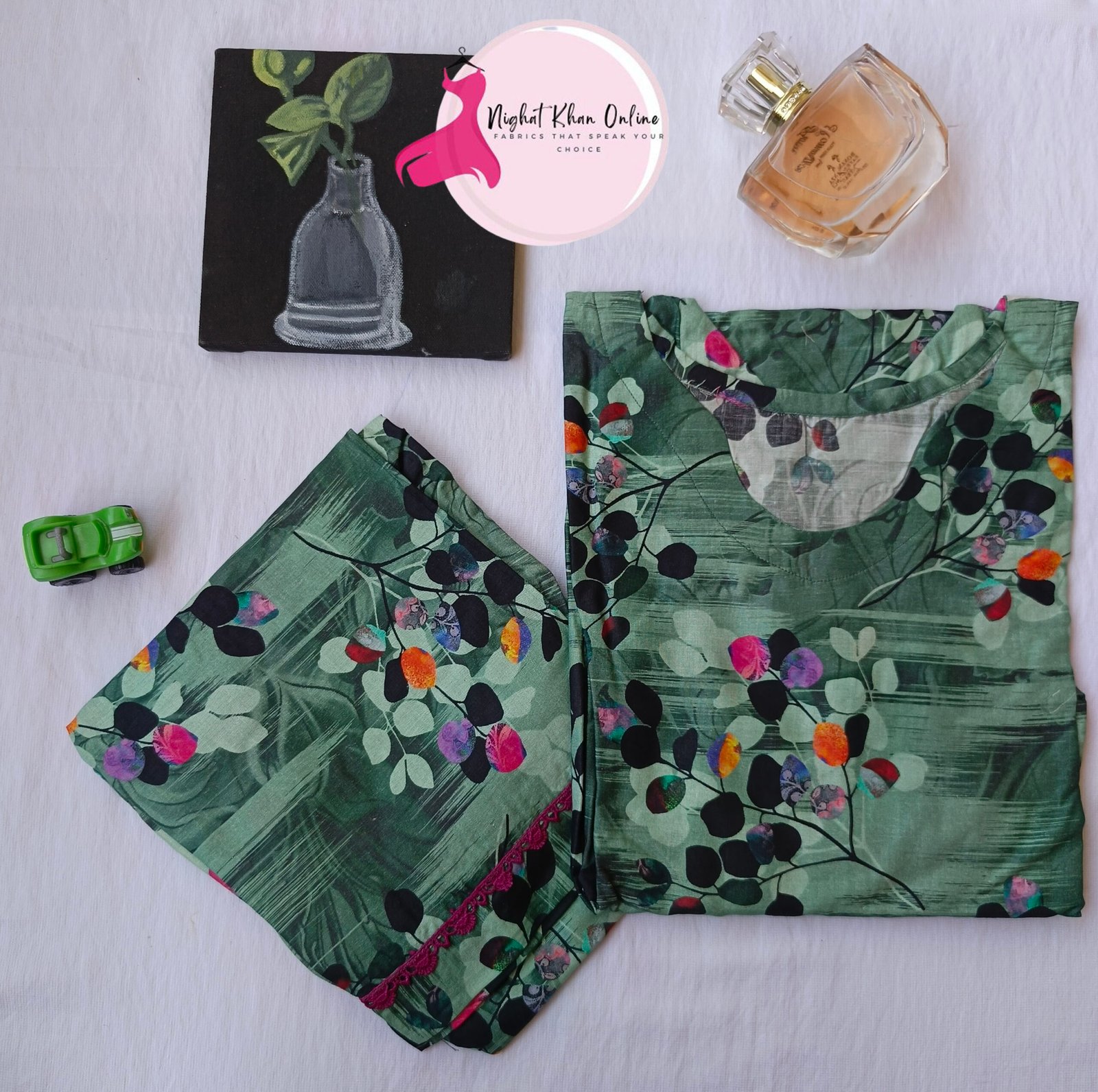 Limited StockA graceful two-piece suit in a refreshing shade of green, adorned with a delicate floral print featuring soft pastel and bold accents. The fluid design and intricate detailing add a touch of elegance, making it a perfect choice for both casual and semi-formal wear.