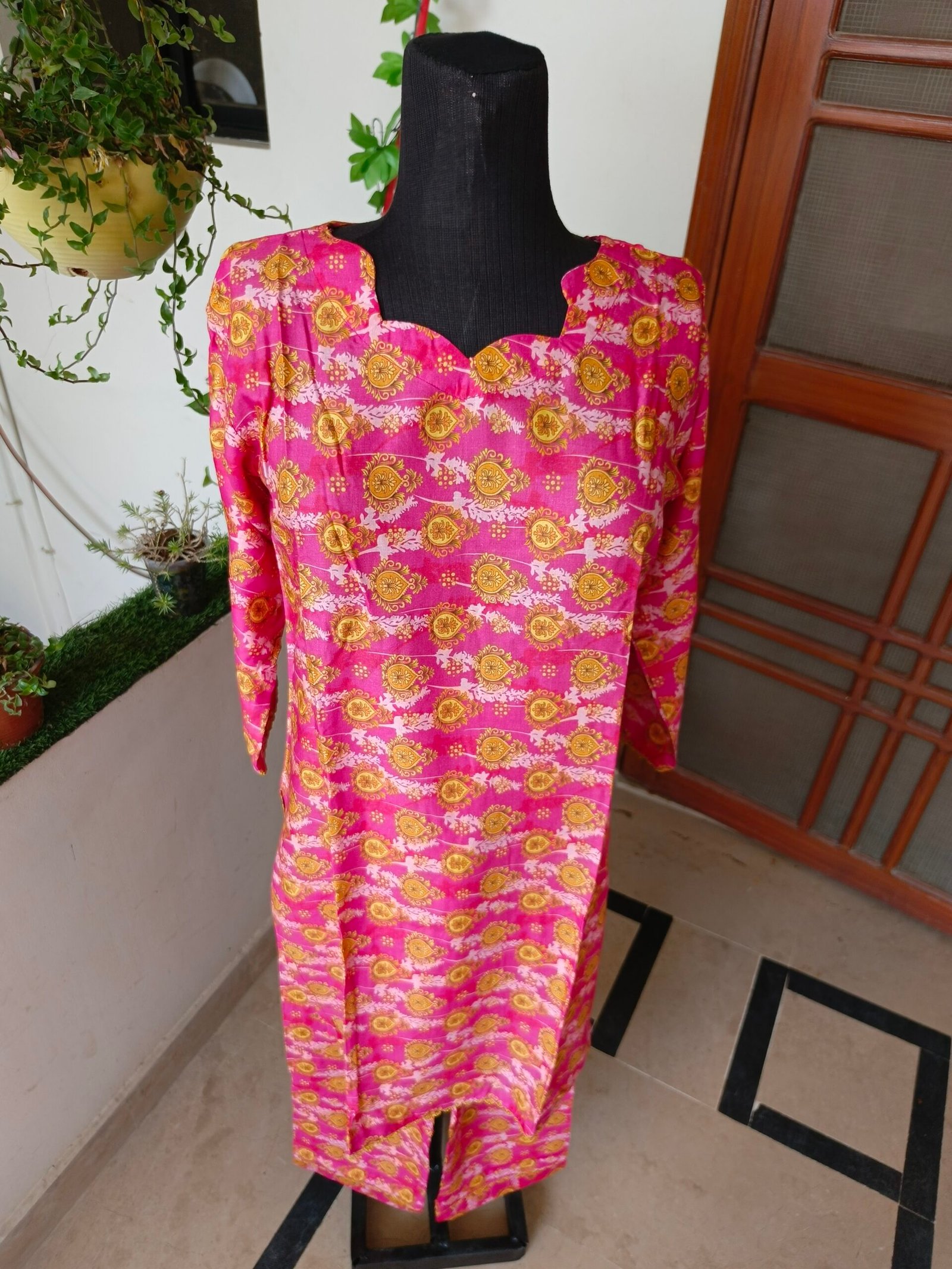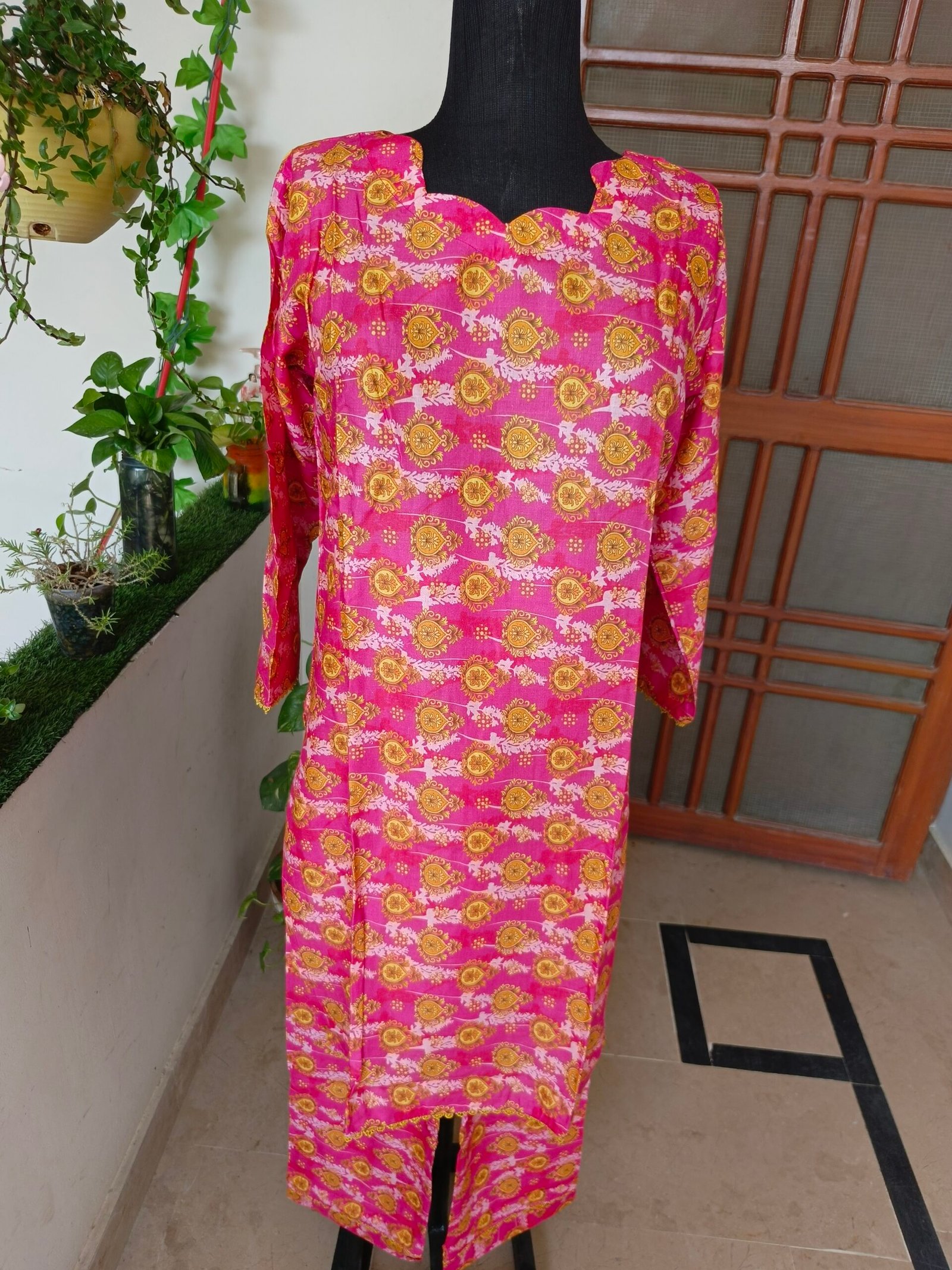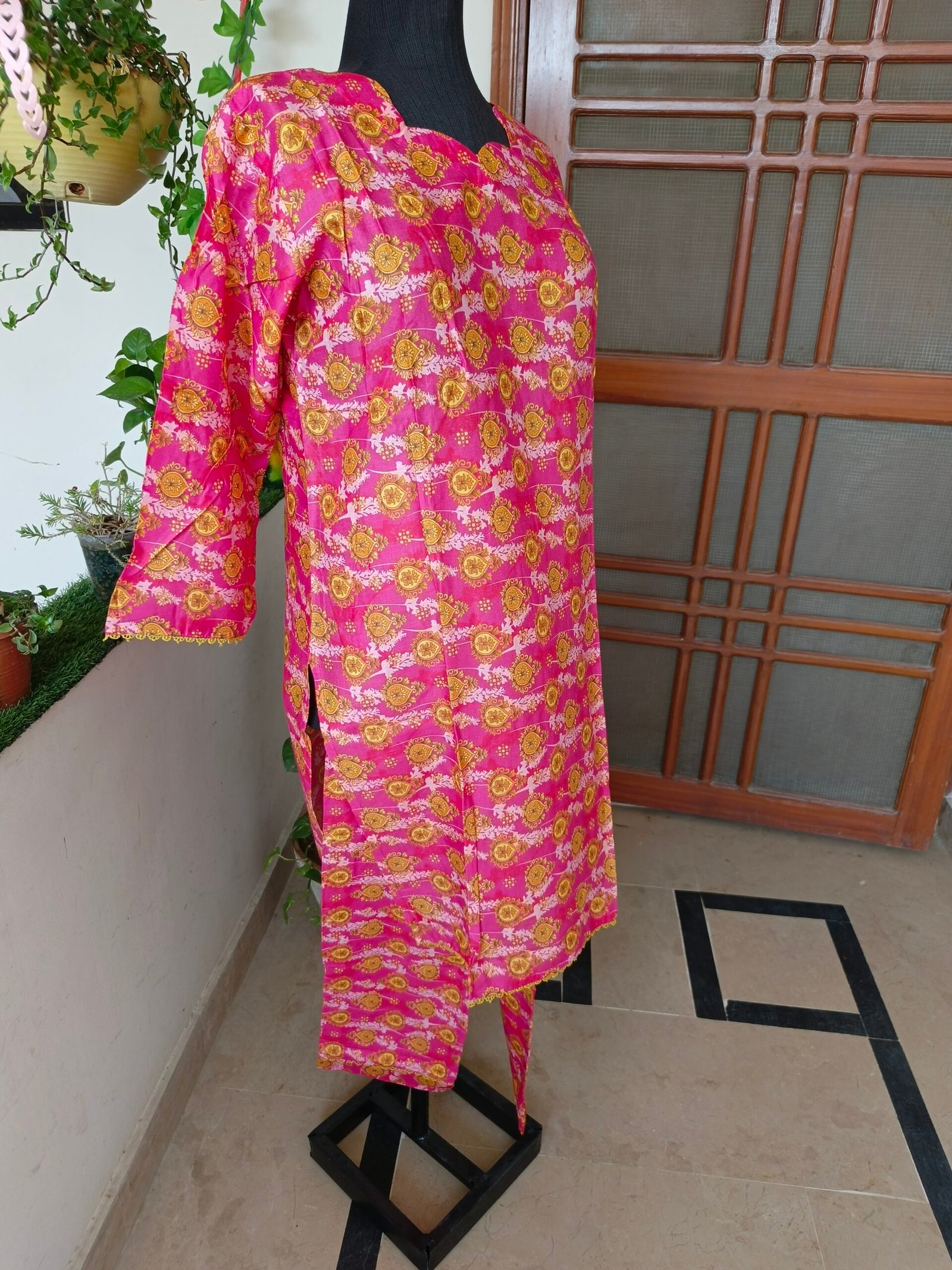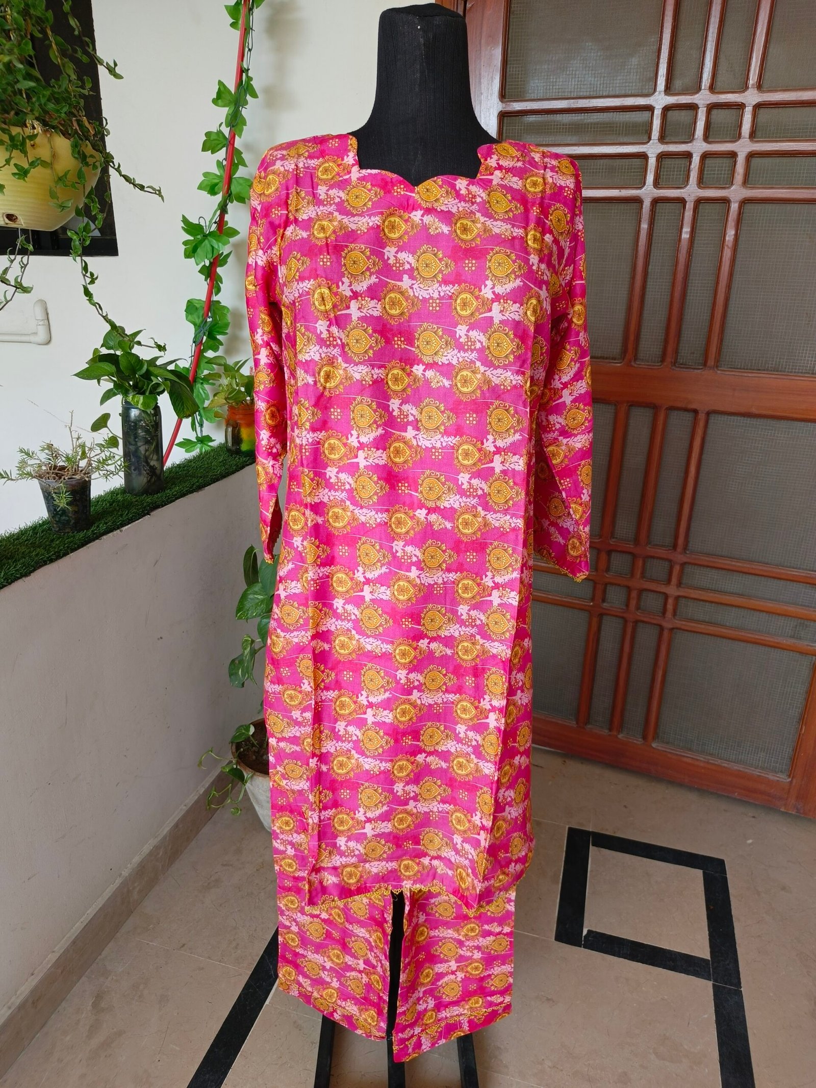 Limited StockA vibrant pink two-piece suit adorned with golden floral patterns. The scalloped neckline adds a touch of elegance, making it a perfect blend of traditional charm and modern style. Ideal for casual and festive wear!