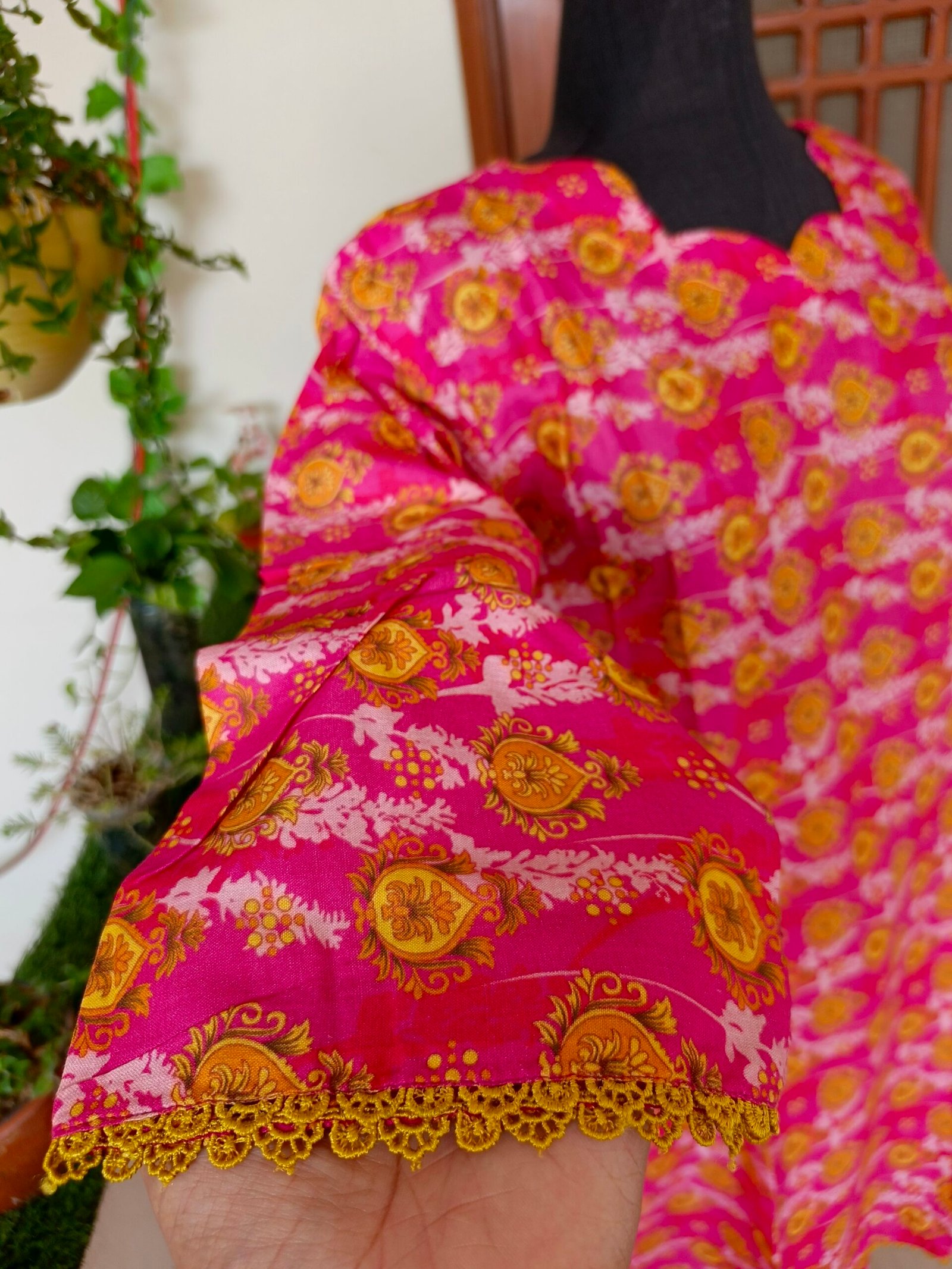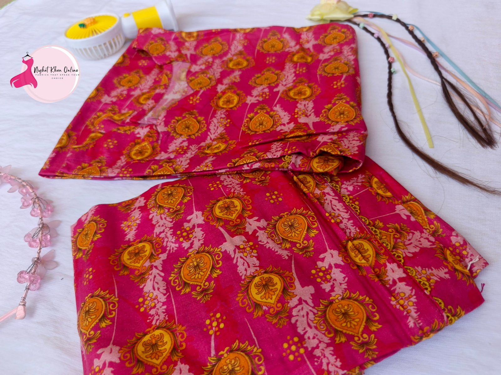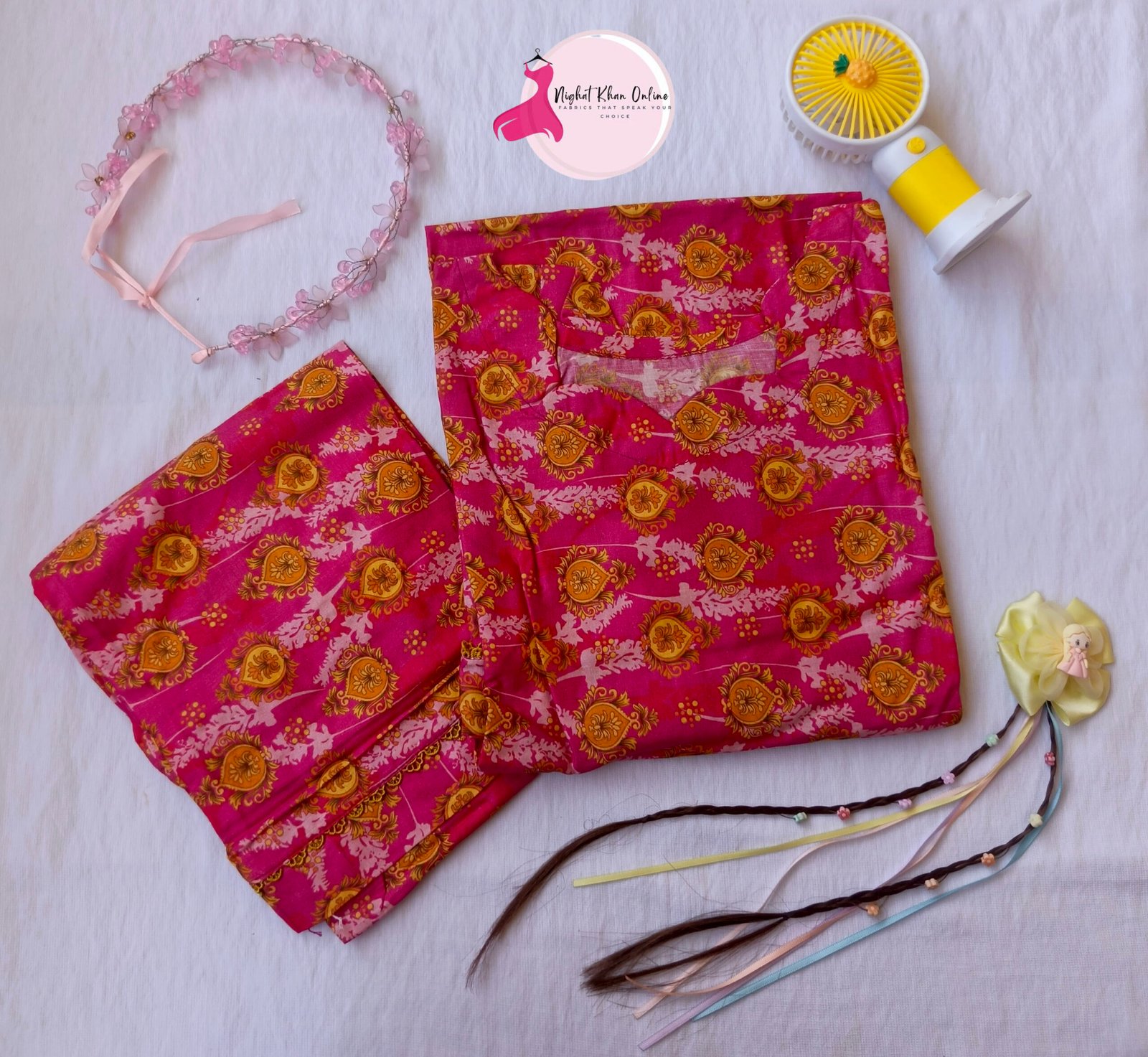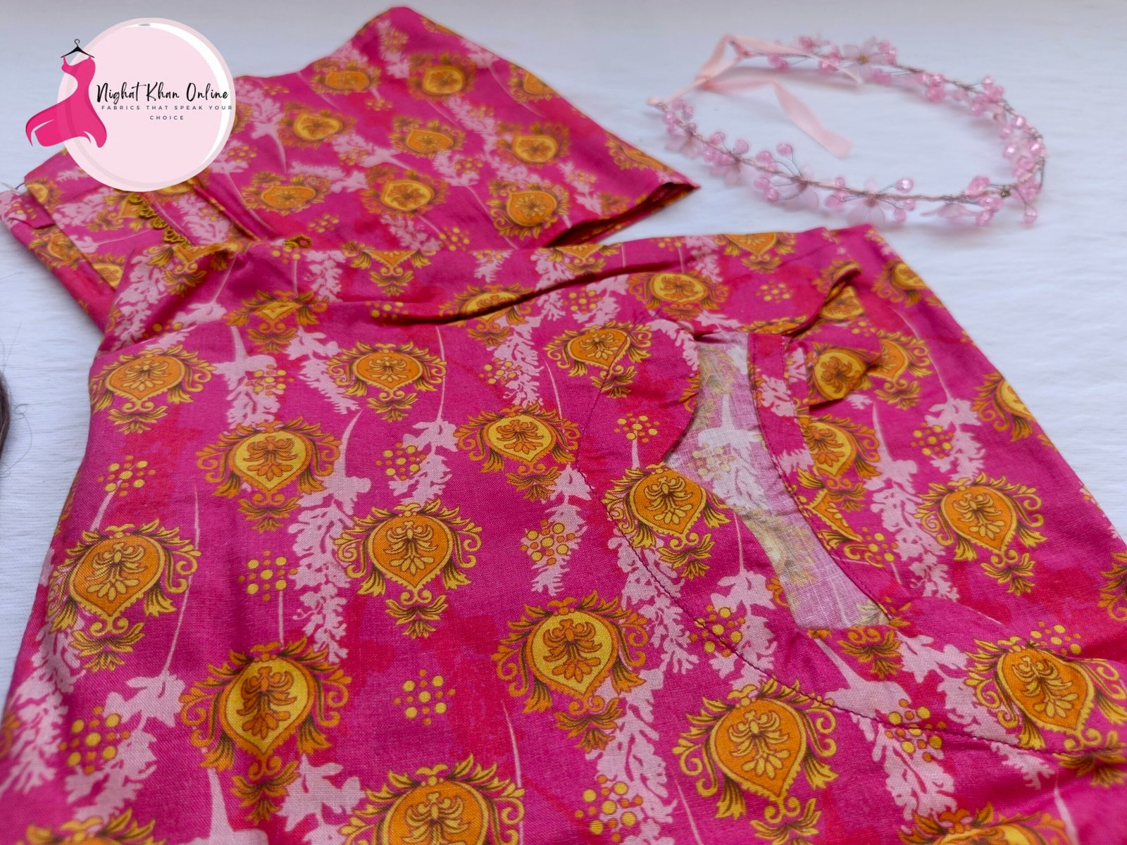 Limited StockA vibrant pink two-piece suit adorned with golden floral patterns. The scalloped neckline adds a touch of elegance, making it a perfect blend of traditional charm and modern style. Ideal for casual and festive wear!